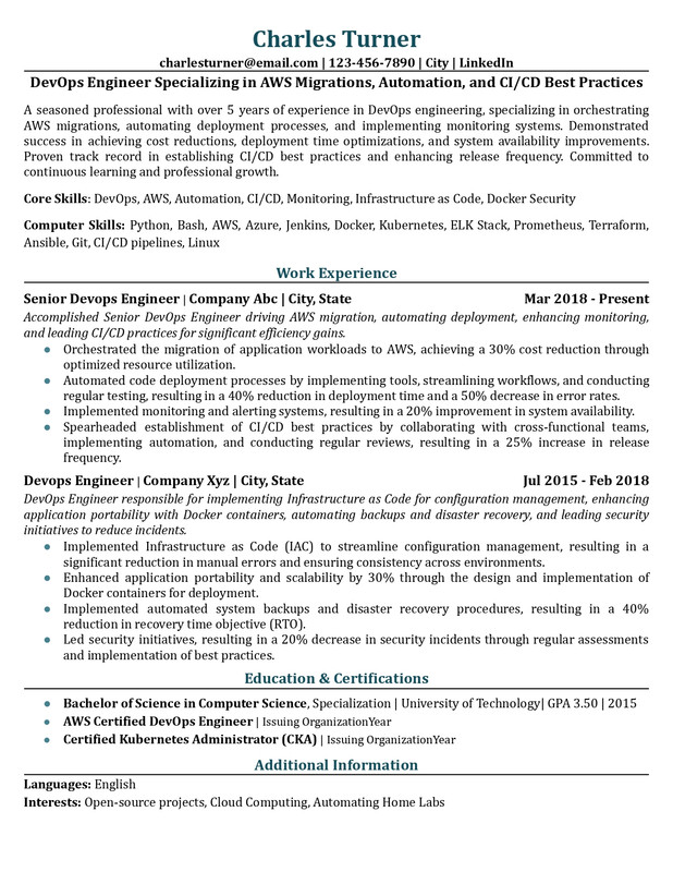 This sample resume works effectively for the role of DevOps Engineer because it demonstrates a strong alignment between the candidate's skills, experience, and the key responsibilities associated with the position. Here's why this resume stands out: 1. ATS Friendly Structure: The resume is well-organized with clear headings and bullet points, making it easy for Applicant Tracking Systems (ATS) to scan and identify relevant keywords. The use of core skills, work experience, education, and certifications sections enables the resume to pass through automated screening processes efficiently. 2. Industry Specific Keywords:The resume incorporates essential industry-specific keywords such as Infrastructure as Code (IAC), CI/CD pipelines (Jenkins), containerization (Docker, Kubernetes), and cloud services (AWS, Azure). These keywords are crucial for showcasing the candidate's familiarity with relevant tools and technologies in the DevOps field. 3. Showcases Challenges, Actions, Results (CAR): - Challenges: The candidate mentions challenges they faced, such as reducing deployment time, optimizing resource utilization, and enhancing system availability. - Actions: The resume clearly outlines the actions taken by the candidate to address these challenges, such as orchestrating migration, automating processes, and implementing monitoring systems. - Results: The resume quantifies the outcomes achieved, including cost reduction, time savings, error rate reductions, and improvements in release frequency. This emphasis on results demonstrates the candidate's ability to deliver tangible benefits to their previous employers. 4. Cross-functional Collaboration: Highlighting collaboration with cross-functional teams to establish CI/CD best practices showcases the candidate's ability to work effectively with different stakeholders towards a common goal, a crucial skill in DevOps roles. 5. Continuous Learning and Skill Development: Mentioning active participation in tech communities, attending seminars, and staying updated on industry trends underscores the candidate's commitment to continuous learning and professional growth, reflecting a proactive approach to staying relevant in the dynamic field of DevOps. 6. Problem-Solving Orientation: The resume implicitly shows the candidate's problem-solving skills through examples of automating processes, enhancing security practices, and improving system performance metrics, indicative of their ability to identify and address challenges effectively. 7. Adaptability and Resilience: The candidate's ability to work effectively in fast-paced environments under pressure further highlights their adaptability and resilience, essential qualities for success in demanding DevOps roles. By incorporating these elements, the resume effectively showcases the candidate's qualifications, experience, and achievements in a manner that aligns with the requirements of a DevOps Engineer role, making it a strong contender for job applications in this field.