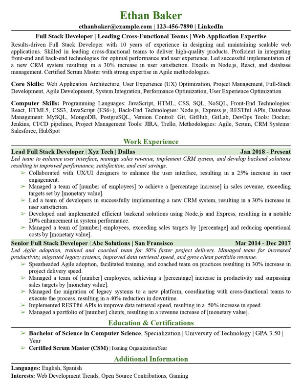 This sample resume works well for the job role of Full Stack Developer for the following reasons: 1. ATS Friendly Structure: The resume follows an Applicant Tracking System (ATS) friendly structure with clear sections such as Professional Summary, Core Skills, Work Experience, and Education. This makes it easier for automated systems to scan and parse the information. 2. Industry-Specific Keywords: The resume includes relevant industry-specific keywords such as Full Stack Development, JavaScript, React, Node.js, Express, Database Management, API Development, Agile Methodologies, and Team Leadership. These keywords are crucial for an employer looking for a Full Stack Developer. 3. Showcases Challenges, Actions, Results (CAR): The Work Experience section of the resume effectively showcases the challenges faced, actions taken, and results achieved in previous roles. For instance, it mentions leading a team in implementing a new CRM system, improving system performance, and enhancing user engagement, demonstrating a track record of successful projects. 4. Highlight of Team Leadership: The resume prominently features the candidate's leadership skills by mentioning experience in leading cross-functional teams, which is crucial for a Full Stack Developer role that often involves collaboration with designers, developers, and other stakeholders. 5. Certifications and Languages: Including certifications like Certified Scrum Master (CSM) and fluency in multiple languages (English and Spanish) adds additional value to the resume, showcasing the candidate's commitment to professional development and their ability to work in diverse environments. 6. Quantifiable Achievements: The resume includes quantifiable achievements such as percentage improvements in user satisfaction, system performance, user engagement, data retrieval speed, and project delivery speed. These achievements provide concrete evidence of the candidate's impact on previous projects. 7. Relevant Work Experience: The candidate's work experience is relevant to the Full Stack Developer role, showing a progression from Senior to Lead roles and a history of working with technologies commonly used in full stack development. Overall, this resume effectively highlights the candidate's skills, experience, achievements, and leadership qualities, making it well-suited for a Full Stack Developer position.