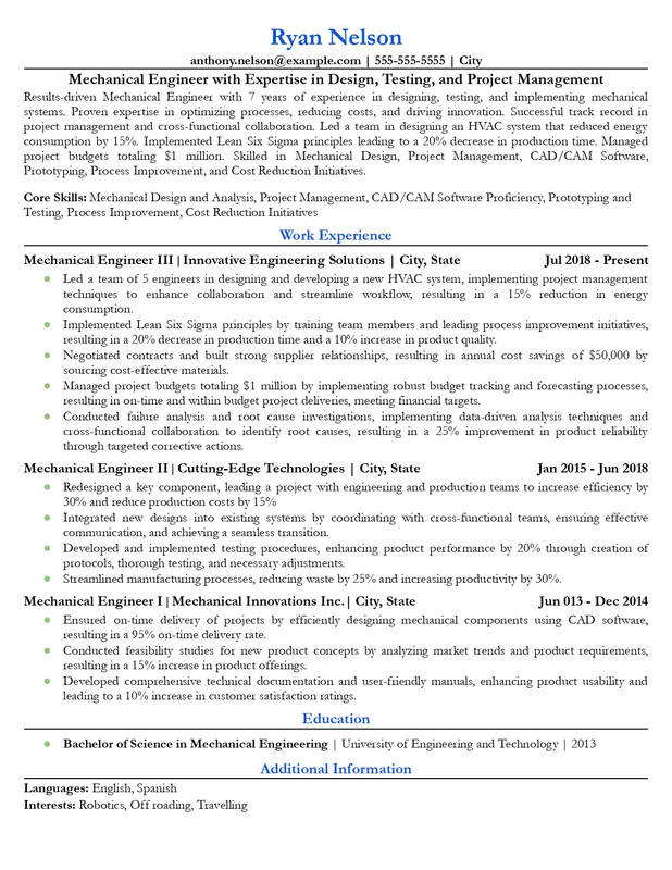 1. Quantified Achievements: The resume consistently uses numbers to demonstrate the tangible impact of Ryan’s work. For instance: “Reduced energy consumption by 15%,” “saved $50,000 annually,” “improved product reliability by 25%.” Quantified results like these provide measurable evidence of success, making it easy for hiring managers to gauge Ryan's contributions. 2. Challenge-Action-Result (CAR) Framework: The resume employs the CAR framework to emphasize problem-solving abilities. For example: Challenge: “Led a team in the design of a new HVAC system.” Action: “Implemented Lean Six Sigma principles.” Result: “Reduced energy consumption by 15%.” This structure showcases his ability to identify challenges, take effective actions, and deliver results, highlighting a systematic approach to problem-solving. 3. Action-Oriented Language: Each bullet point begins with strong action verbs like “Led,” “Implemented,” “Spearheaded,” and “Collaborated.” These verbs emphasize Ryan’s proactive role in driving projects and initiatives, underscoring his leadership and ability to execute effectively. 4. Use of Core Skills in Context: Ryan’s core skills—such as mechanical design, project management, and process improvement—are not just listed but illustrated through specific job accomplishments. For example, his proficiency in Lean Six Sigma is demonstrated through actions like reducing production time by 20% and increasing product quality by 10%, ensuring his skills align with the needs of prospective employers. 5. Progressive Career Growth: The resume effectively demonstrates career progression, moving from Mechanical Engineer I to Mechanical Engineer III. Each job role builds on the previous one, showcasing increased responsibility (e.g., managing project budgets, leading teams), indicating career growth and expertise. 6. Cross-Functional Collaboration: Ryan’s ability to work with different teams (e.g., collaborating with suppliers, cross-functional teams) is highlighted throughout. This speaks to his adaptability and teamwork, which are critical in multidisciplinary engineering environments. 7. Balanced Focus on Technical and Leadership Skills: While technical skills like CAD design and failure analysis are emphasized, the resume also showcases leadership qualities, such as mentoring junior engineers and managing project budgets. This balance appeals to employers looking for well-rounded candidates who can not only perform technically but also manage and lead teams effectively. This resume works well because it presents a well-rounded professional who is both technically skilled and capable of leading teams, with a clear focus on measurable impact, growth, and collaborative success.