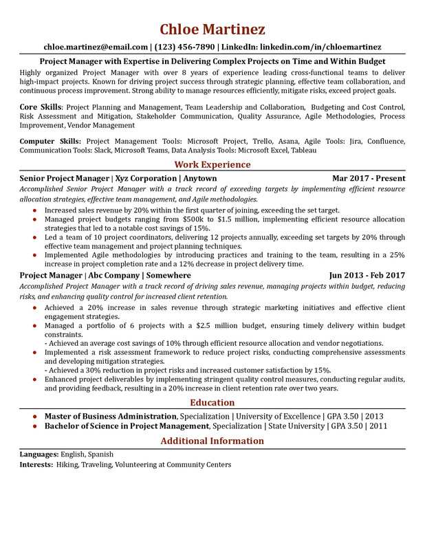 1. Results-Oriented Summary: The professional summary clearly highlights Chloe's experience and expertise in project management, emphasizing her track record of delivering projects on time and within budget. This immediately captures the attention of hiring managers looking for a seasoned professional.